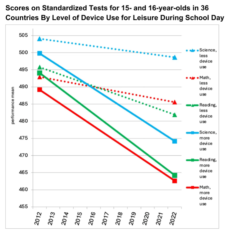 Figure 1: Scores on standardized tests of math, reading, and science for 15- and 16-year-olds in 36 countries, by low or high use of electronic devices for leisure during the school day. Note: Controlled for GDP per capita. Source: Twenge (2025) using data from PISA.